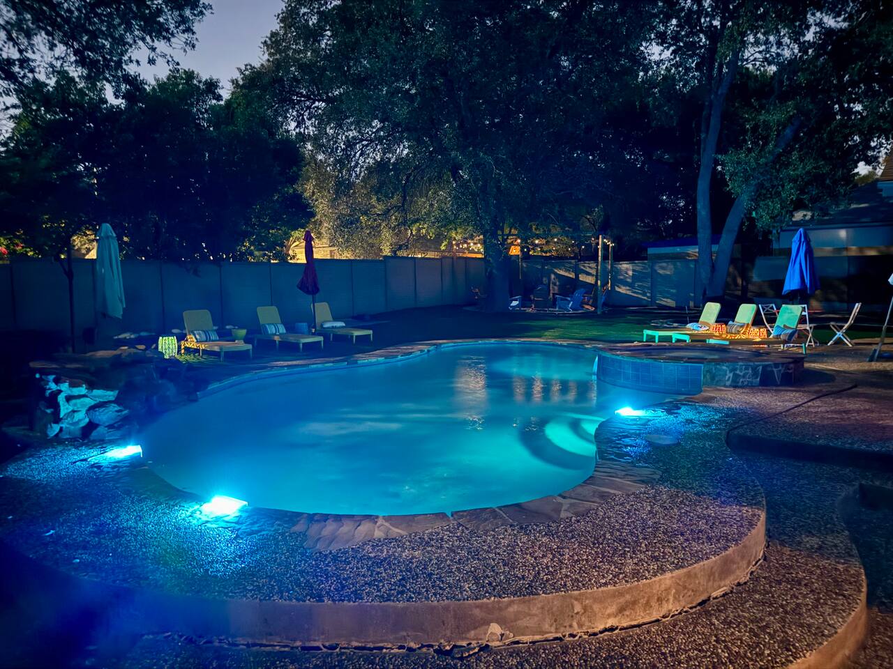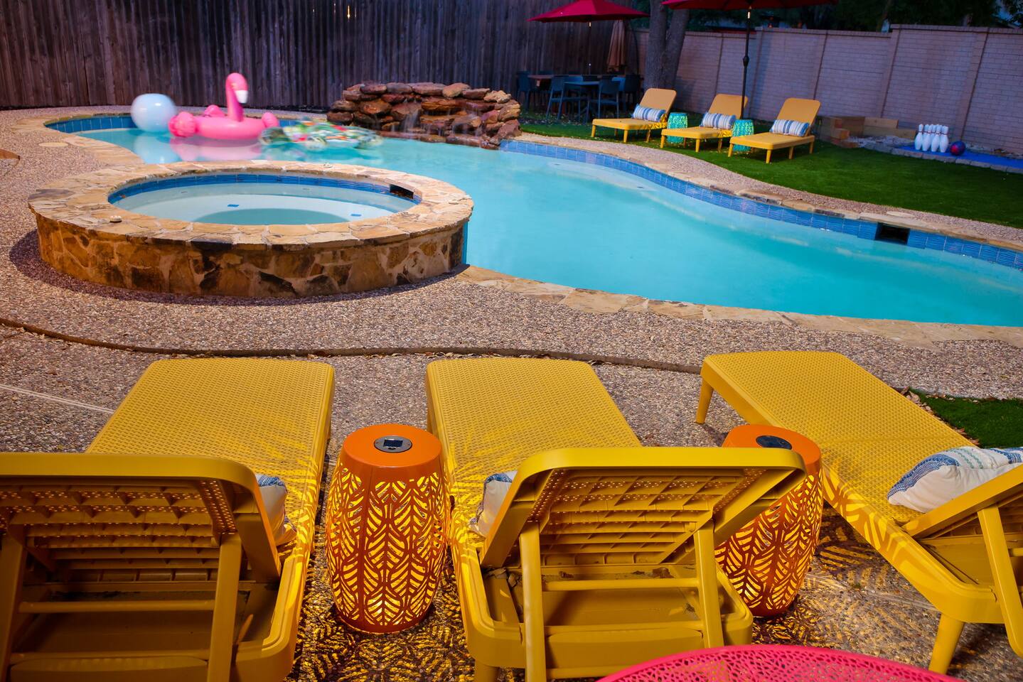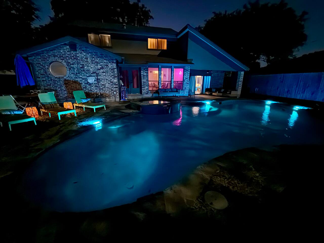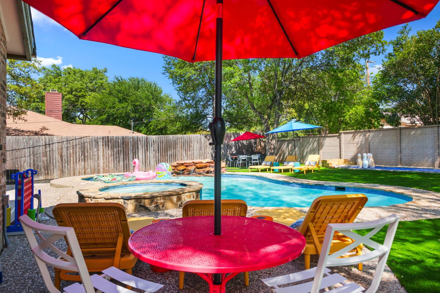Top 3 Guest Compliments 1. "The kids never wanted to leave!" – Jose, May 2025 2. "Peaceful neighborhood, but close to everything." – Elizabeth, Jul 2025 3. "Hosts were quick, friendly, and always there when needed." – Nicole, Jun 2025 Your Private Family Resort in San Antonio Step into a colorful escape where every corner is designed for fun, laughter, and connection. With space for 14 guests, this vibrant retreat blends the best of a luxury resort and a playful family home — no wristbands required. Why You’ll Love It Here: - Heated pool + hot tub for year-round splashing and soaking - Backyard mini-golf, bowling, and a fire pit under twinkling lights - Kids’ game room with custom bunk beds and a yellow slide - Indoor arcade, pool table, and air hockey for nonstop competition - 10–25 minutes to Six Flags, the Alamo, Riverwalk, Zoo, and Lackland AFB - Summer splash days or cozy winter hot tub nights — fun awaits year-round Perfect for Air Force BMT Graduation Families - Just 25 minutes to Lackland AFB, so this home is ideal for celebrating your Airman’s achievement - Room for grandparents, kids, friends, and everyone in between - Plenty to do between ceremonies — pool time, games, and outdoor gatherings Bedrooms - King Suite – Plush king bed, ensuite bath with walk-in shower and double vanity - Double Queen Room – Two queen beds, colorful decor, TV, and storage - Additional Queen Rooms – Cozy beds, TVs, cheerful accents - Kids’ Bunk Room – Twin bunks with slide, foosball, shuffleboard, and board games Kitchen & Dining - Fully stocked kitchen with modern appliances - Coffee bar with Nespresso, Keurig, and French press - Indoor dining table for 10+ - Outdoor covered dining with colorful umbrellas Entertainment Everywhere - Backyard mini-golf and bowling alley - Pool table, air hockey, and arcade games - Board games, books, and a kids’ nook under the stairs - Fire pit for evening s’mores and stories Outdoors - Heated pool and hot tub for every season - Shaded lounge area with outdoor TV and ceiling fans - Fully fenced backyard for peace of mind Why Families Love It From sunrise coffee on the patio to nighttime hot tub chats, this home makes every moment easy to enjoy. Families often skip going out because "there’s too much to do right here." Even in cooler months, the hot tub, fire pit, and game rooms make it a perfect escape. ✅ Local compliance standards followed ✅ Easy self check-in with smart lock ✅ Personalized guest portal with local tips and upgrade options