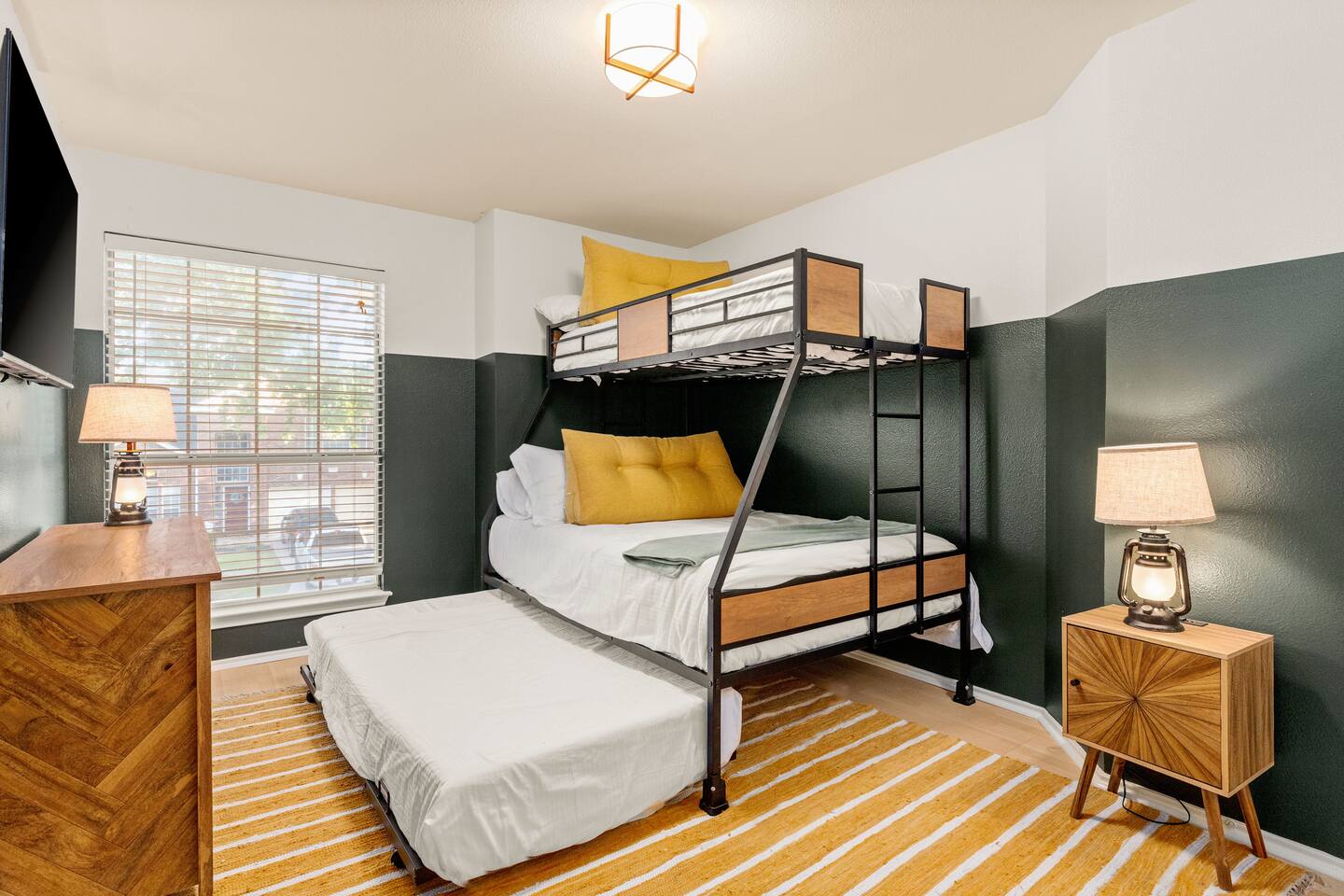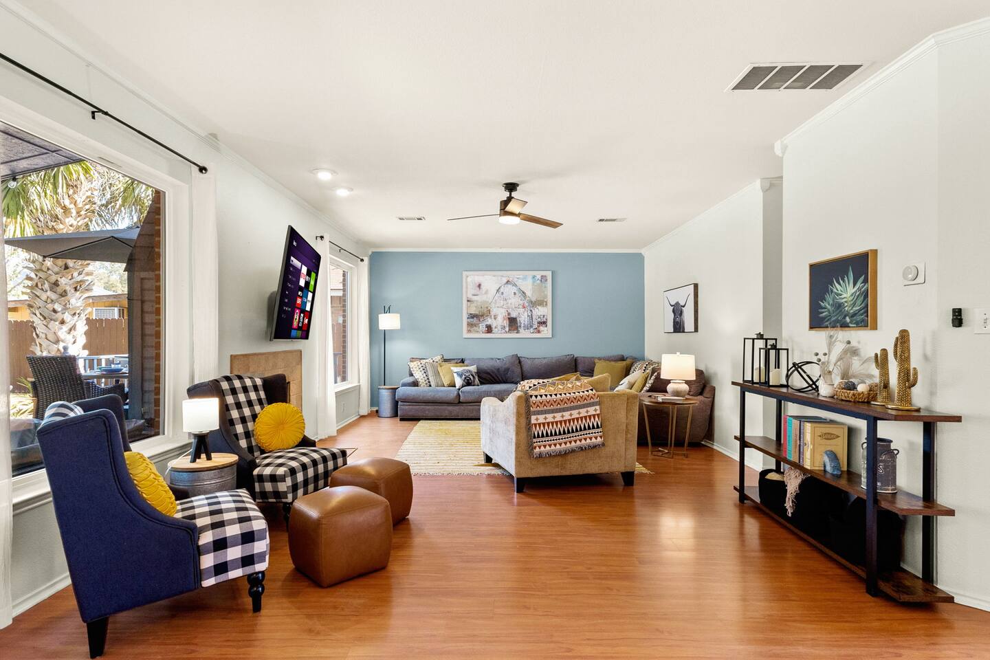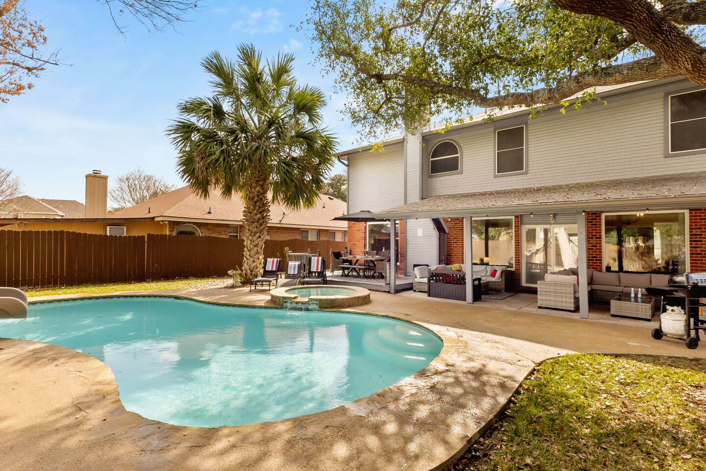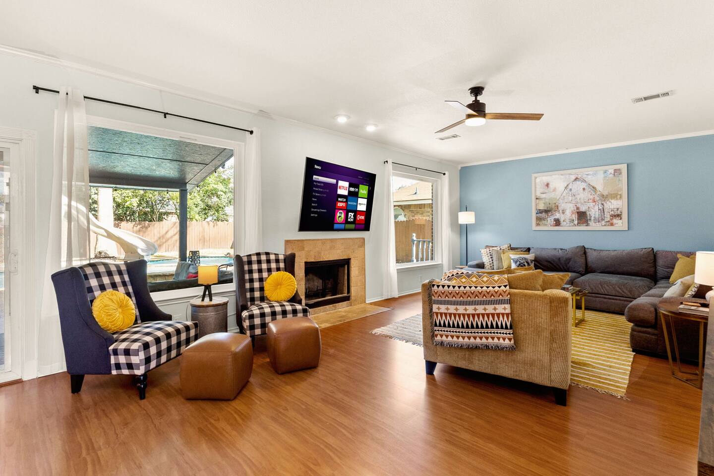Indoor Living Spaces Gather up the family and make yourself cozy in our expansive living room, complete with a wrap-around sectional sofa lined with plush chaise cushioning. Stream your favorite shows or excite the gamer in the group with the Xbox 5, all on a 75” Smart TV! For some friendly competition, there's an abundance of board games provided; Not into streaming? Challenge each other with classic board games or let the kids take over upstairs for their very own movie night. Cooking & Dining Are you a master of the kitchen? This fully-equipped kitchen has everything for your cooking adventures. Generously stocked with a spice rack, baking sheets, pots & pans galore – plus necessary tools like blenders, crockpots and a toaster – there won't be an ingredient or technique left unperfected in any dish. Afterwards, savor special meals in our spacious dining room seating up 8 lucky guests while overlooking your backyard oasis! Additional seating for 7 between the kitchen table and island. Or dine alfresco and soak in your outdoor paradise, complete with dining space and lounge area. Sleeping Accommodations and Bathrooms The home sleeps up to 12 people, making it an ideal space for family reunions, bachelor or bachelorette parties, wedding parties or traveling with friends! All of the bedrooms are outfitted with incredible mattresses that we regularly get compliments on. They're so good we bought one for our own house! The perfect abode for family and friends, the home is equipped with 4 spacious bedrooms perfectly situated on one level. Resting easy won't be a problem as 3 of these rooms offer luxurious king-sized beds while the 4th reveals its laid back vibes through an inviting twin over full bunk bed frameset that also includes a cozy trundle underneath. All of the bedrooms are equipped with 55in Smart TV's so you can wind down with a movie or your favorite show. Outdoor Living Spaces Get ready for luxury in your own backyard. Relax under the covered patio with a grill sizzling, dinner on the outdoor dining table, and cozy lounge chairs perfect for an evening spent star-gazing. And that's before you dive into the heated pool featuring its very own thrilling slide! An in-ground hot tub awaits to melt away any cares or worries of every day life - all just steps from your back door! <b>**ABOUT OUR HEATED POOL**</b> Our pool and spa can be heated year round, however depending on the outside temperatures during your stay, it could be more difficult to heat during January and February's coldest temperatures. Thank you for understanding. While the pool won’t reach hot-tub temperatures, the pool is consistently maintained at 86º degrees November to April/May. Our pool team comes to take care of the home on Thursday or Friday. On the coldest days of the year, our pool may not reach the set temperature due to the extreme cold. Most heat pumps do not function as well when outside temperature is less than 55 degrees. We’re happy to provide this added comfort at no extra charge, so you can focus on enjoying your stay. Please note that pool temperatures will vary slightly based on weather conditions. *** ✅ This property follows local compliance standards and uses a simple, secure platform called Happy Guest to streamline the check-in process. You don’t need to download an app or create an account — it’s just a quick and secure website that gives you everything you need for a smooth arrival. You’ll also get access to your personalized guest portal, where you can find all the info about the home and some of our favorite local spots. The portal also offers optional upgrades to help you customize your stay: • Extra Guest – $50 • Late Checkout – $50 • Stock the Fridge – $100 <b>★☆ Book Today & Let Us Take Care Of You In San Antonio! ☆★</b>